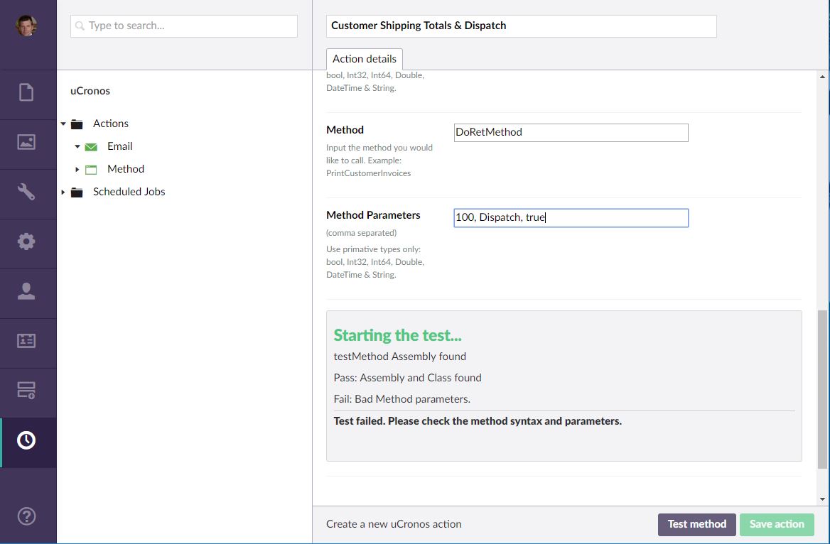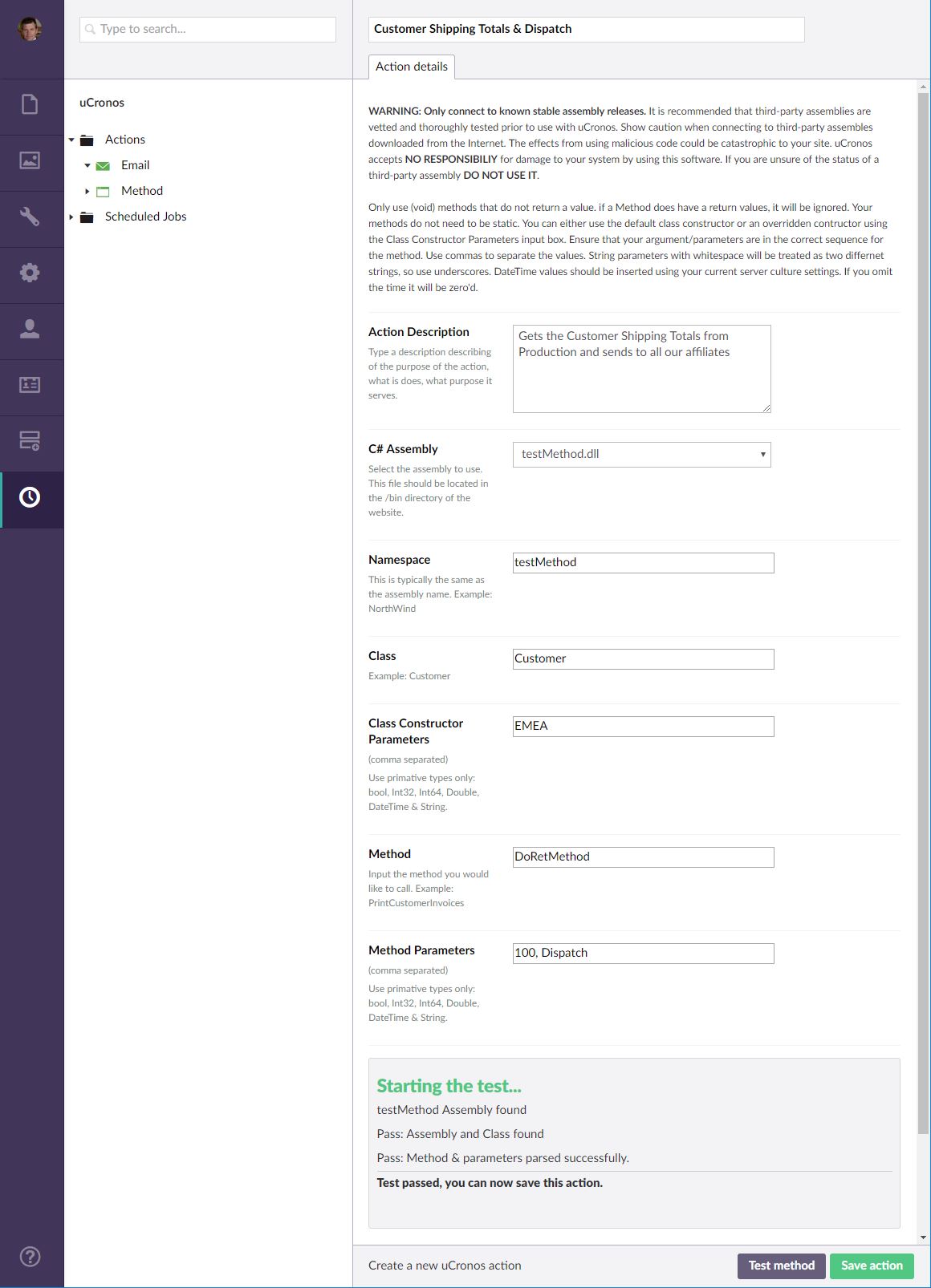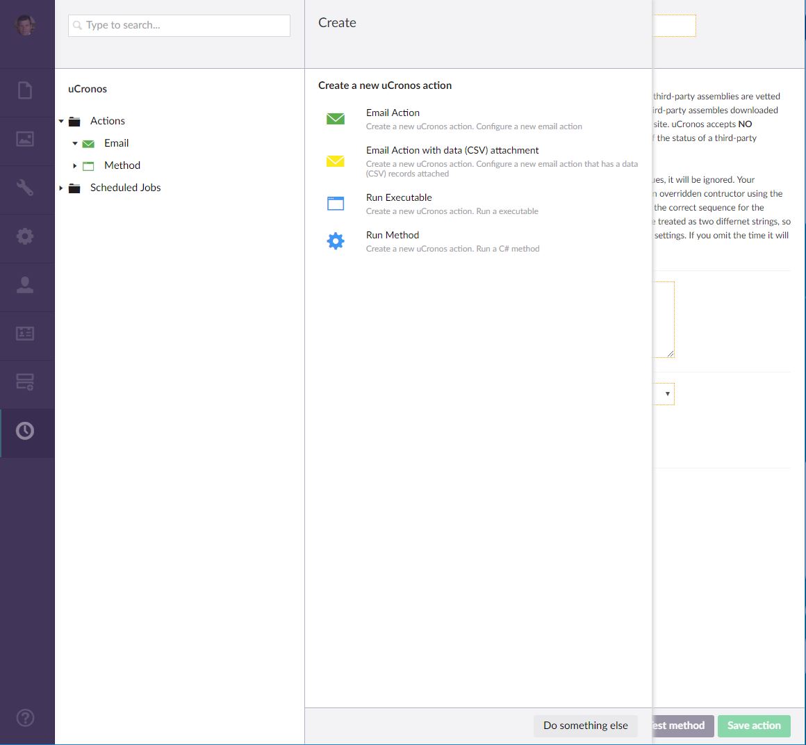 The add-on installs a new "Action" option that allows users to fire custom assembly methods via the uCronos / Hangfire scheduling features. Once installed, a fourth action is available in the uCronos Action tree. This new action called "Run Method" follows the same process to create actions that are assigned to Scheduled Jobs.