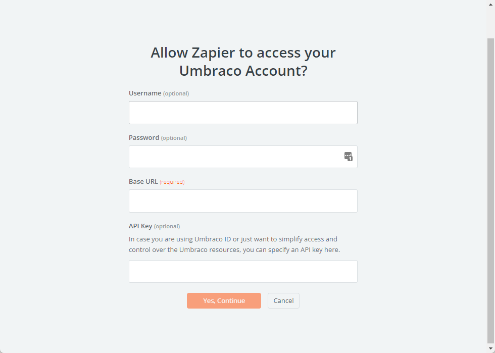 Authentication is managed on Zapier's side by using the Umbraco marketplace app. Access can be granted by providing credentials for a backend user, or by using an API key.