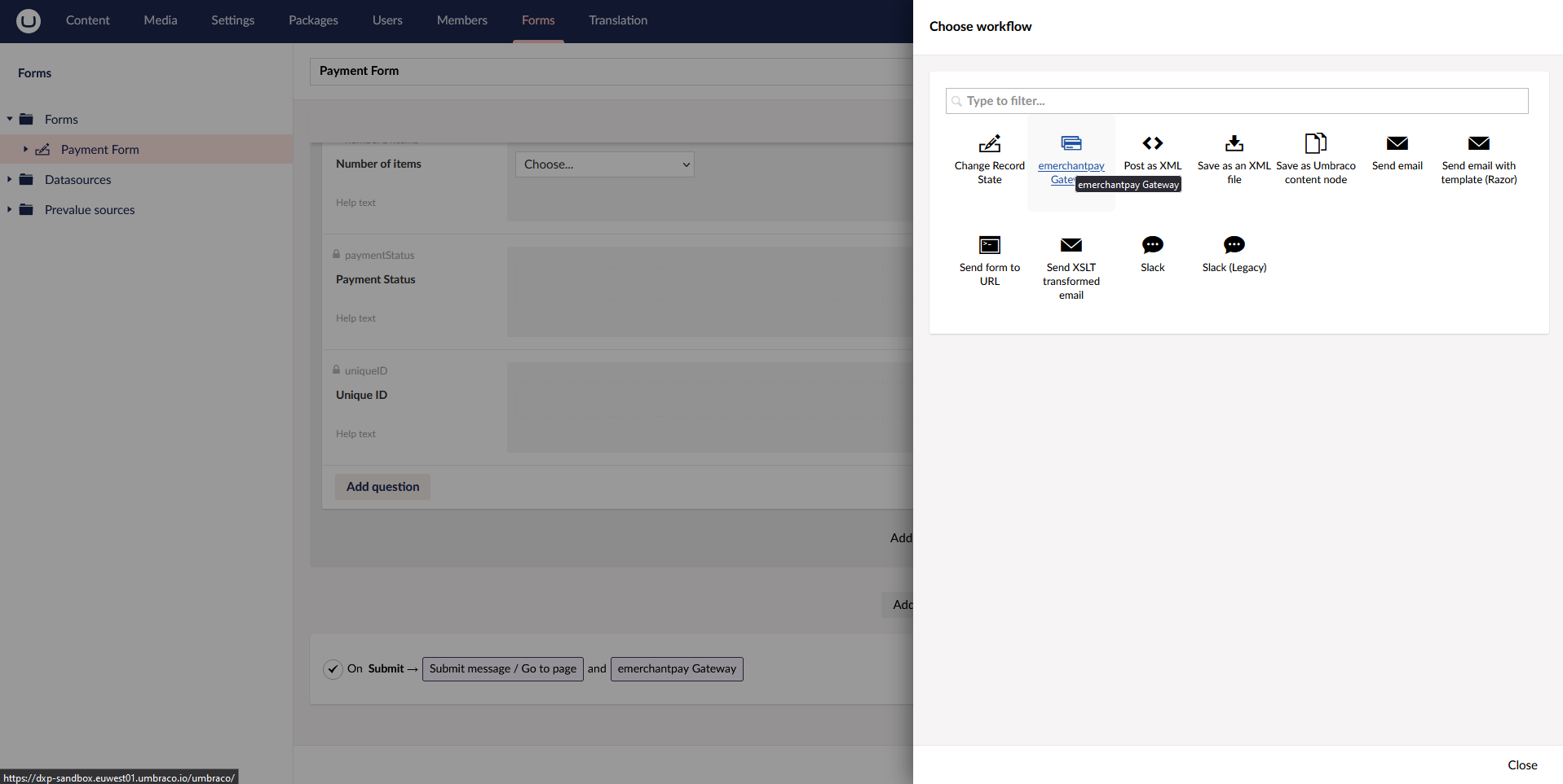 Provides a custom workflow for Umbraco Forms for handling online payments using a hosted payment page provided by emerchantpay.