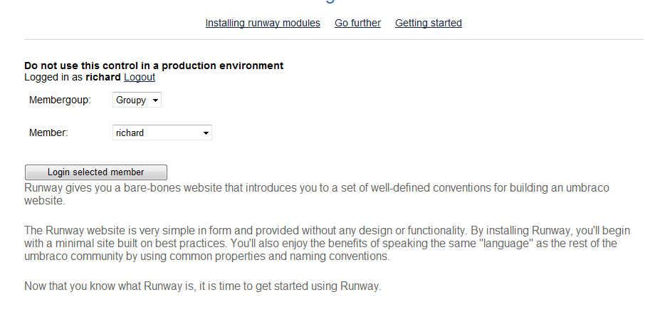This package let's you easily login members and switch between members by simply selecting a member from a pull down list instead of enter the username and password. This is ideal for testing purposes when developing sites that require login with different users and roles.