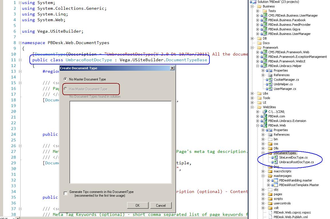 Ok, now we can see that DocumentType wizard recognized that there are already some document types declared in the project and offered us to use Page as a master document type for this newly created document type. You can certainly choose 'No Master Document Type' option if you don't want your document type to have a master document type. For our News document type we do want Page as its master document type so click on OK. The following class will be generated for you: