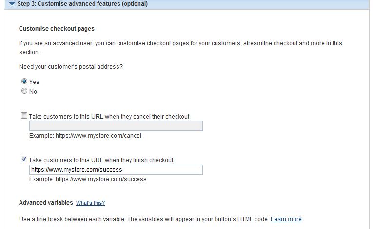 In my Set-up button I selected to take customers to a thank you URL