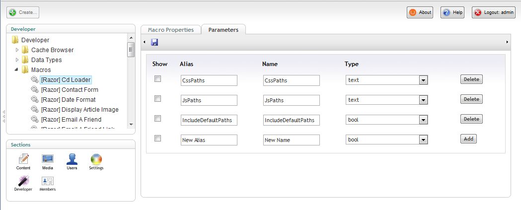 The CWS_CdLoader macro is not working properly in Umbraco 4.7.1.1. This is due to the parameters must be set in the macro too: