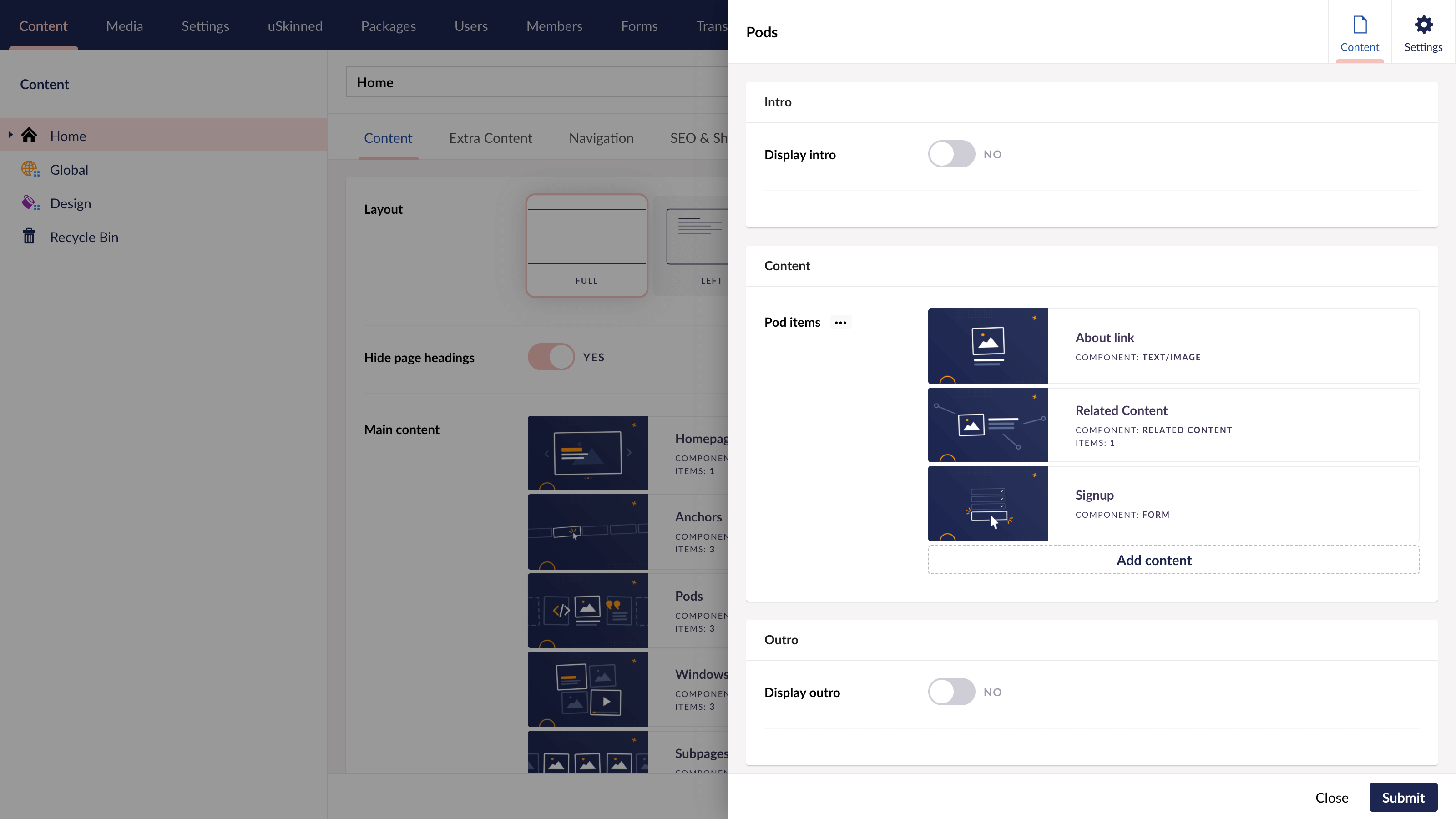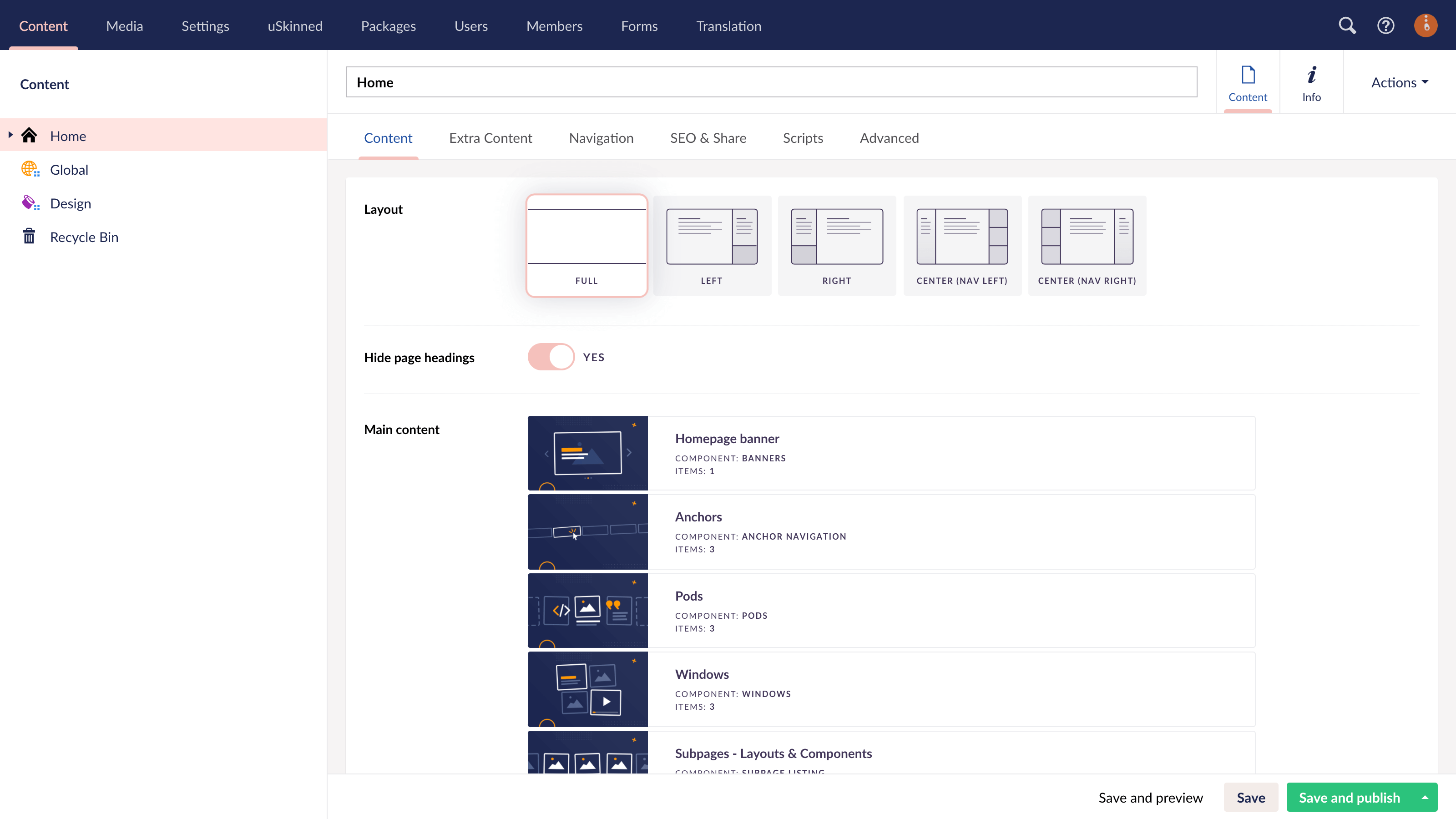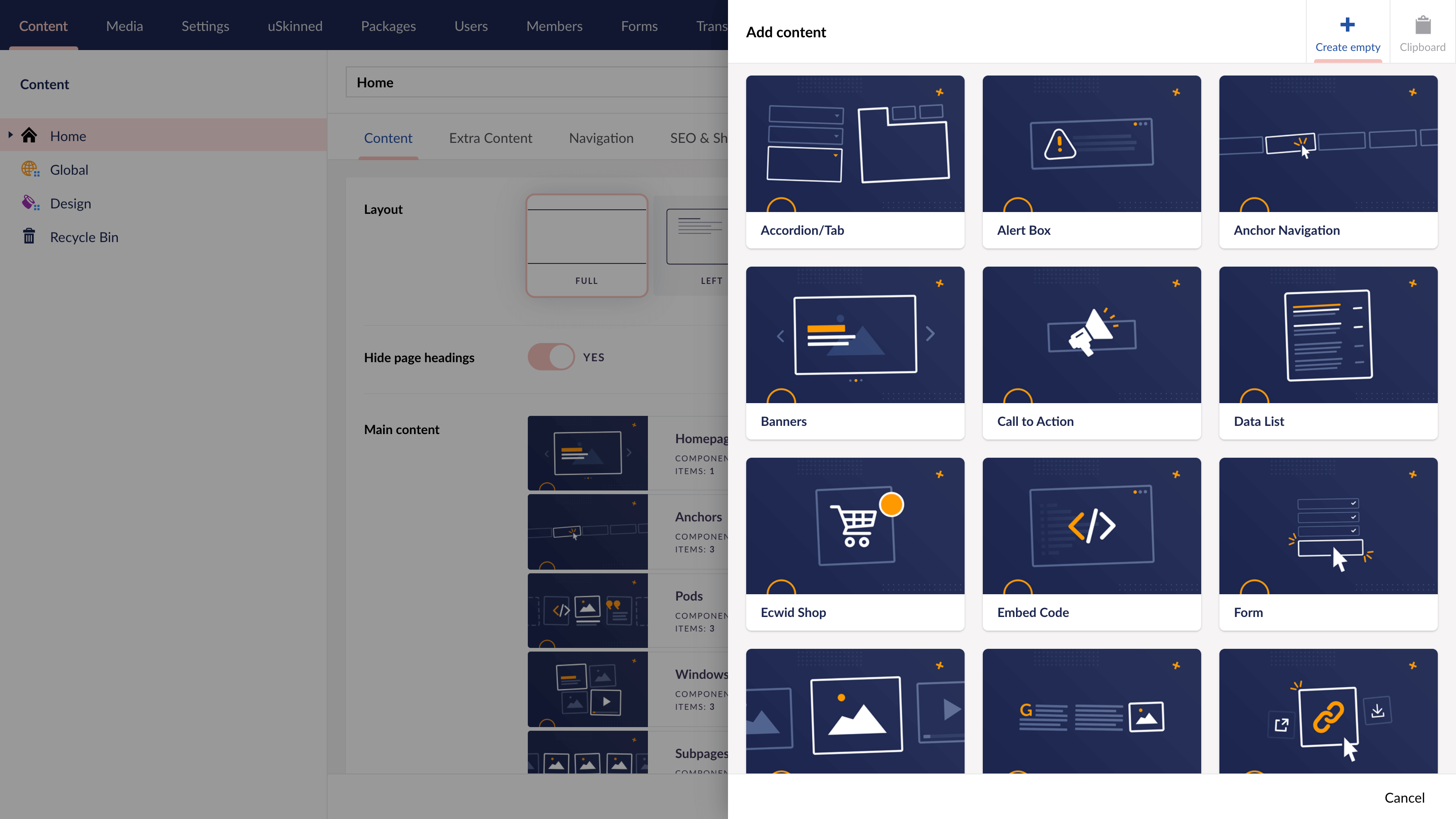 Add, edit, delete and reorder the content of your uSkinned site with our drag and drop block component editor.