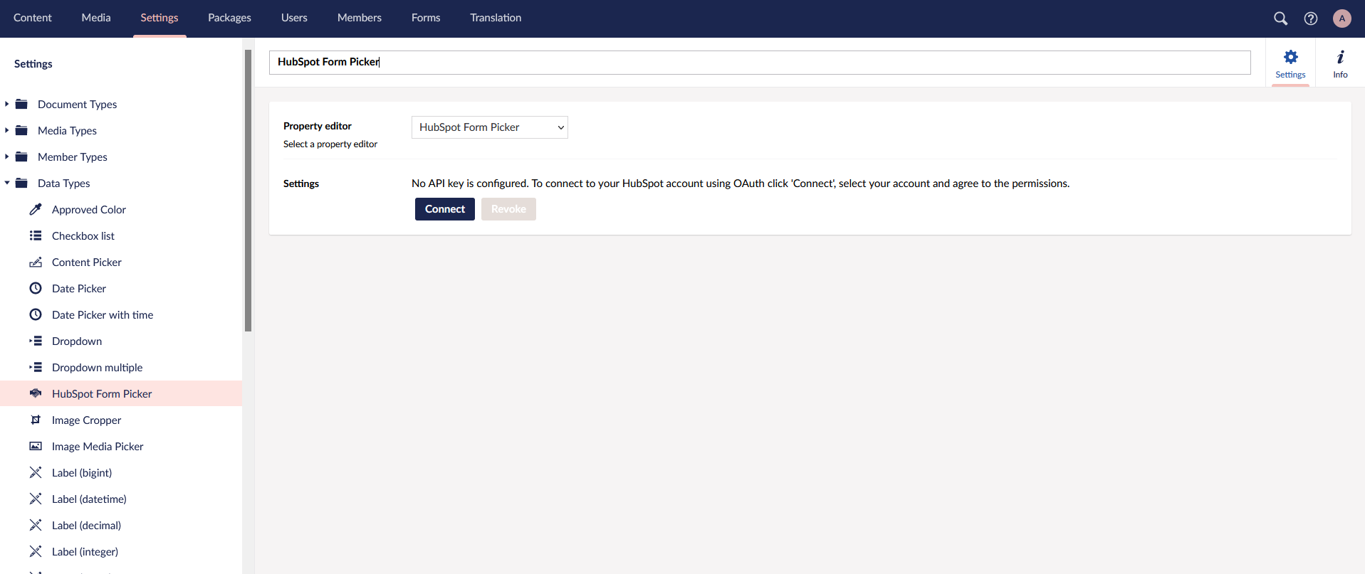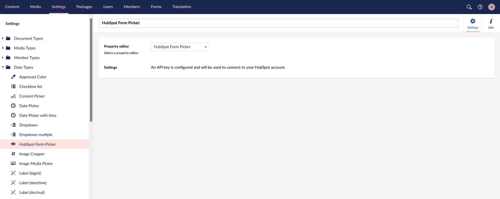 To use the form picker, a new data type should be created based on the HubSpot Form Picker property editor.