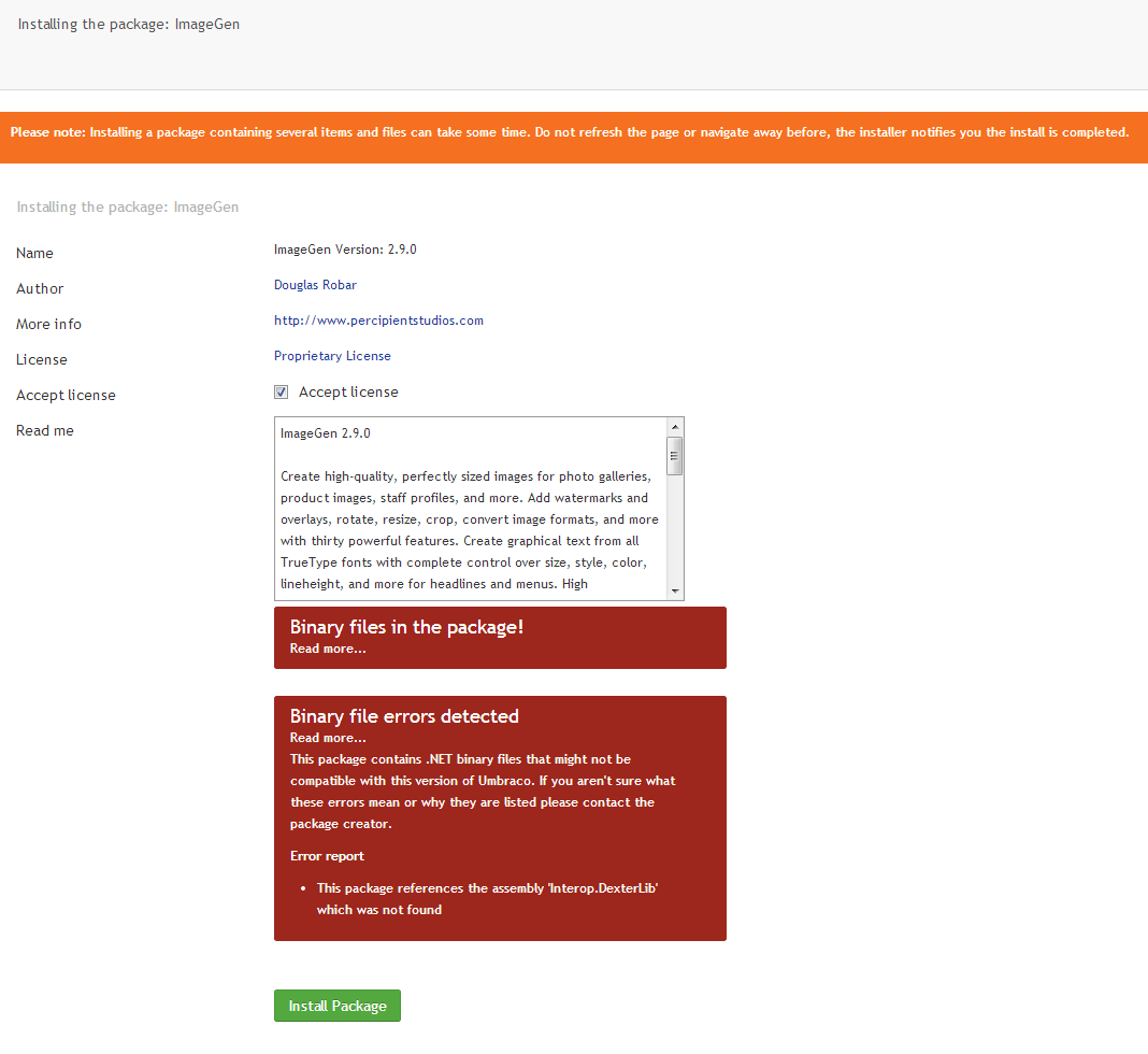 The warning is for the Interop.DexterLib dll, which is not currently included in the ImageGen package. ImageGen runs perfectly without that dll but because it's referenced the new Umbraco 7 installer's reflection code notices and gives the warning.