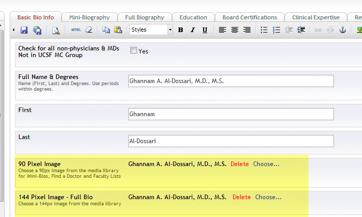 For each faculty member, we create a node in the content area. Current practice is to specify 3 sizes of images in content node. This means 3 images are uploaded to the media library and 3 are selected. Only 2 are shown below, but in actuality we need three sizes. The image used is determined by out applications we have built, fore example, for Nancy Ascher: